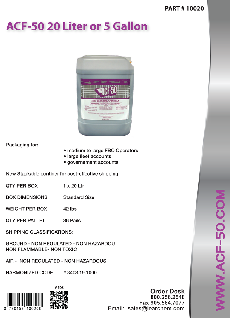 HOW IT WORKS: ACF-50, Anti-Corrosion Formula, is a state of the art, anti-corrosion lubricant compound, specifically designed for the Aerospace Industry. It is an ultra Thin Fluid Compound (TFFC) that actively treats metal using advanced polar bonding technology.